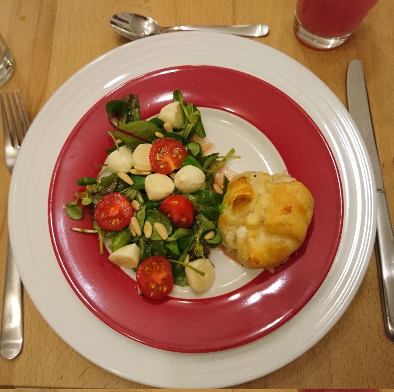 Ziegenfrischkäse mit Birnen-Chutney im Blätterteig an Salat mit Tomate, Mozzarella und Erdbeer-Basilikum-Dressing